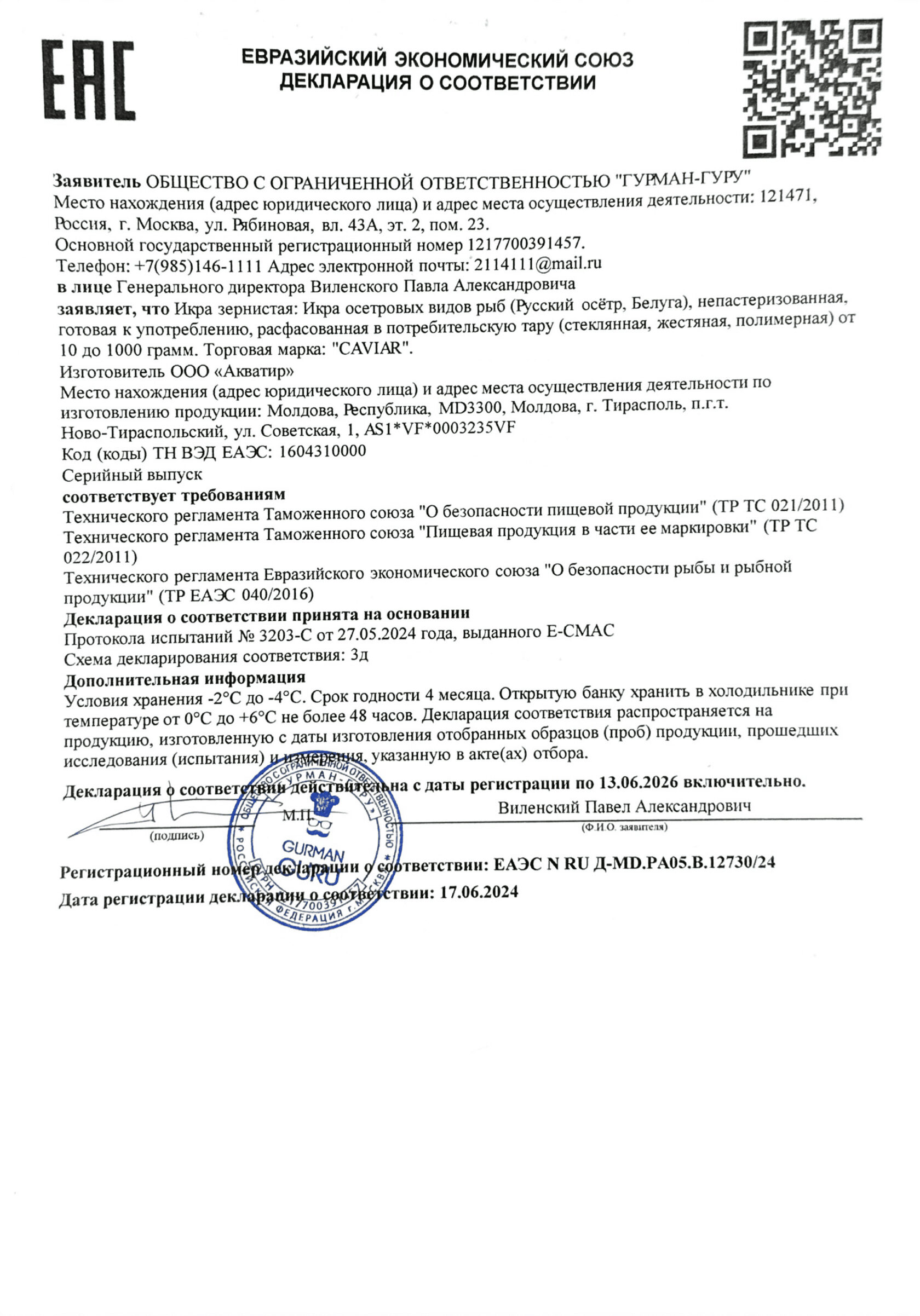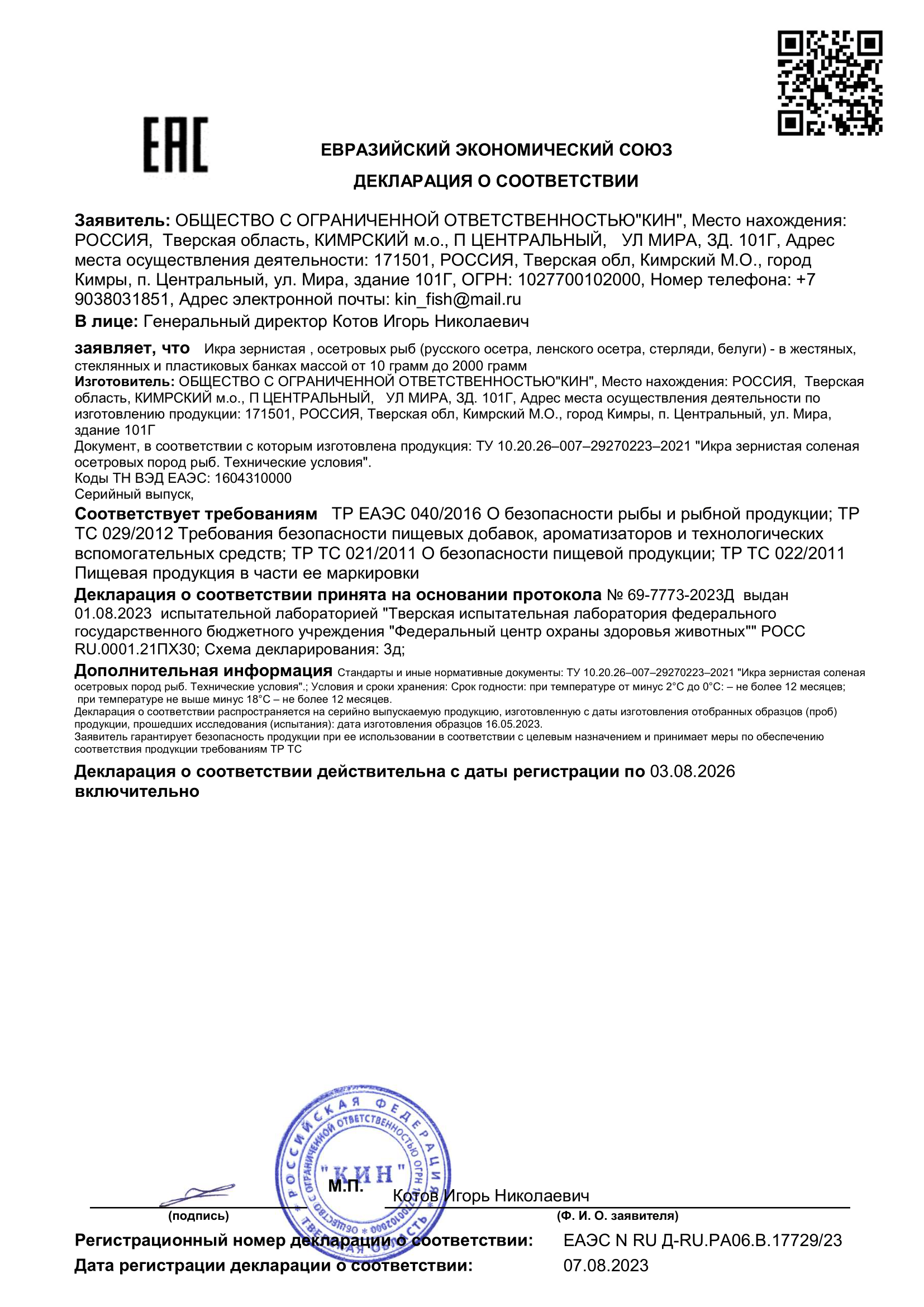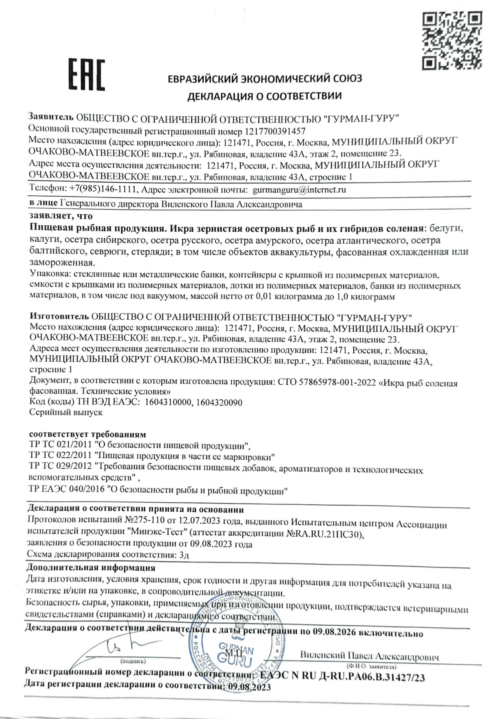 Да, вся икра имеет соответствующие сертификаты качества и документы, подтверждающие происхождение и безопасность продукции