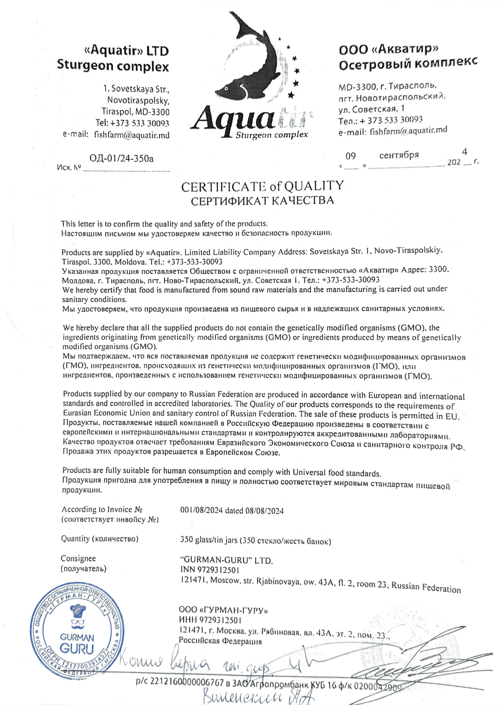 Икра поставляется с сертифицированных рыбных ферм, специализирующихся на осетровых, с контролем экологических стандартов.